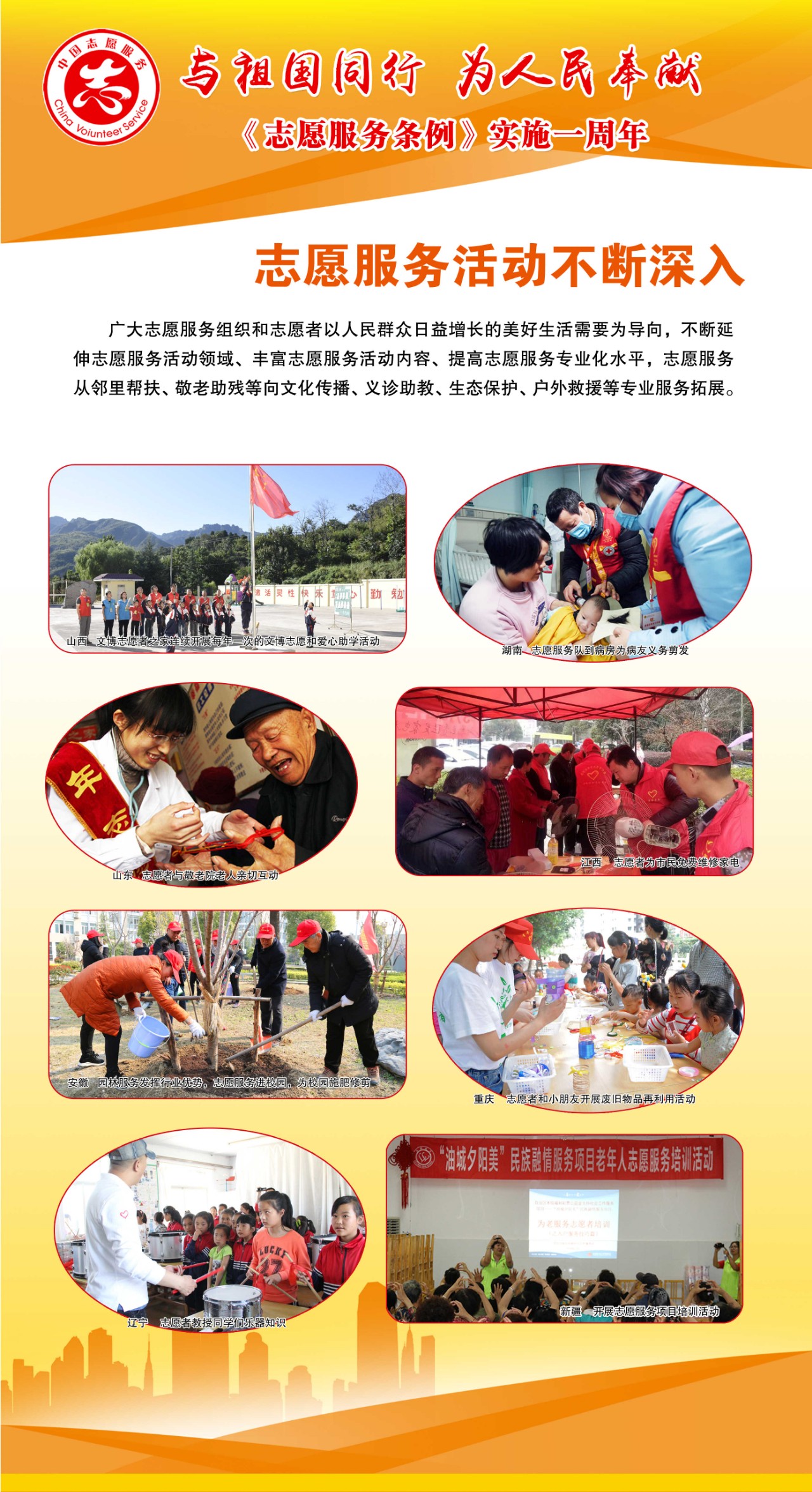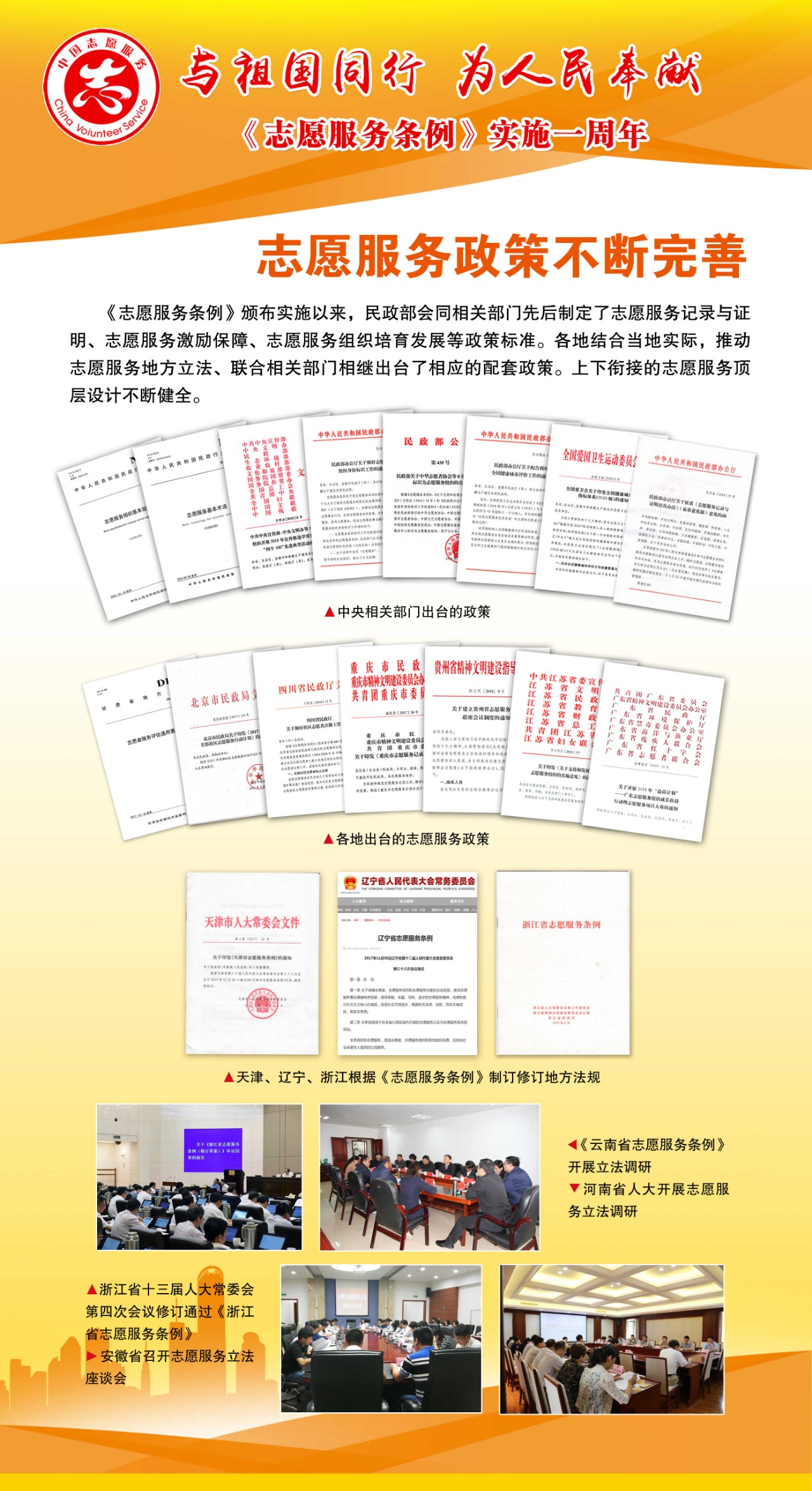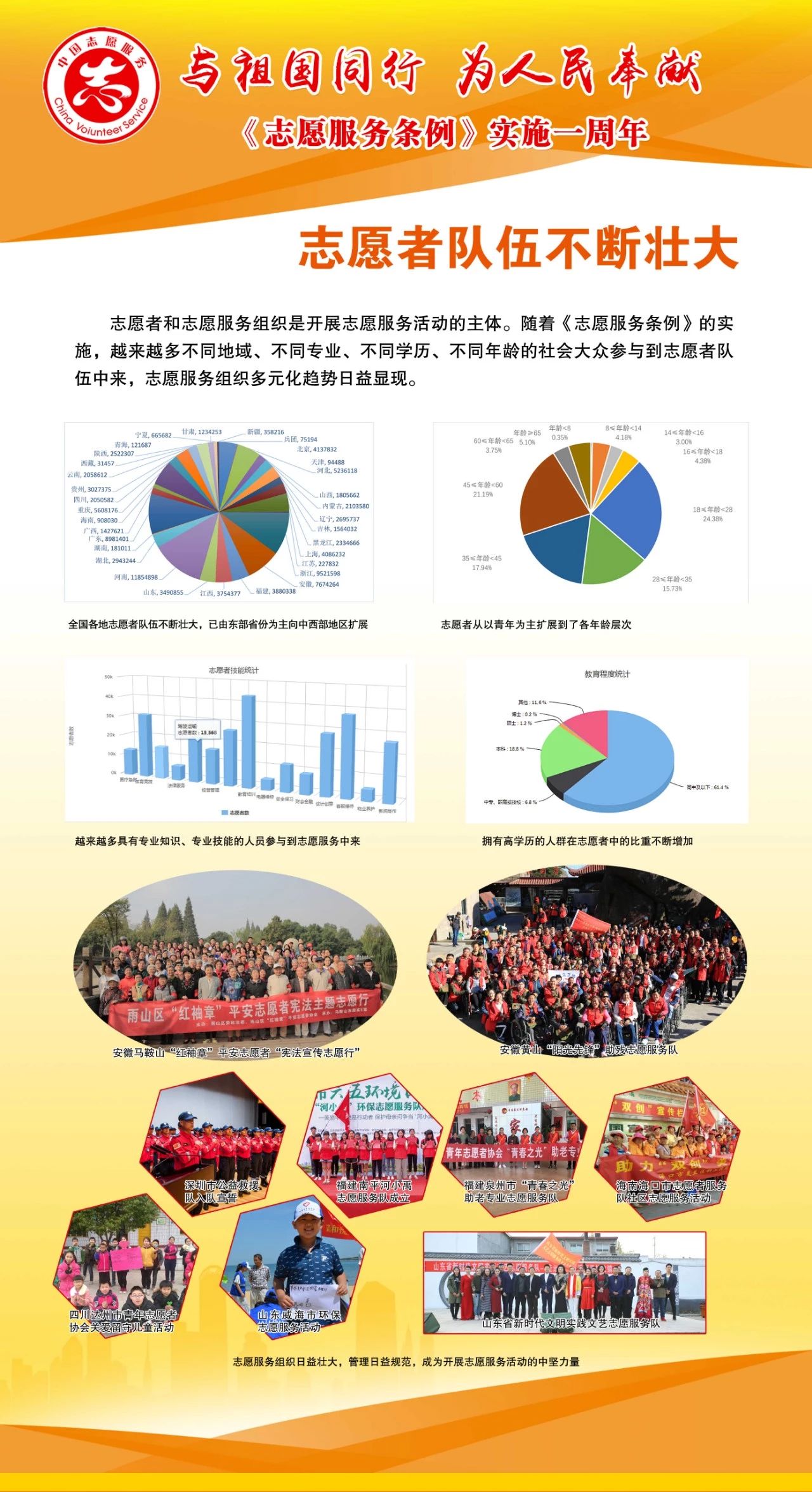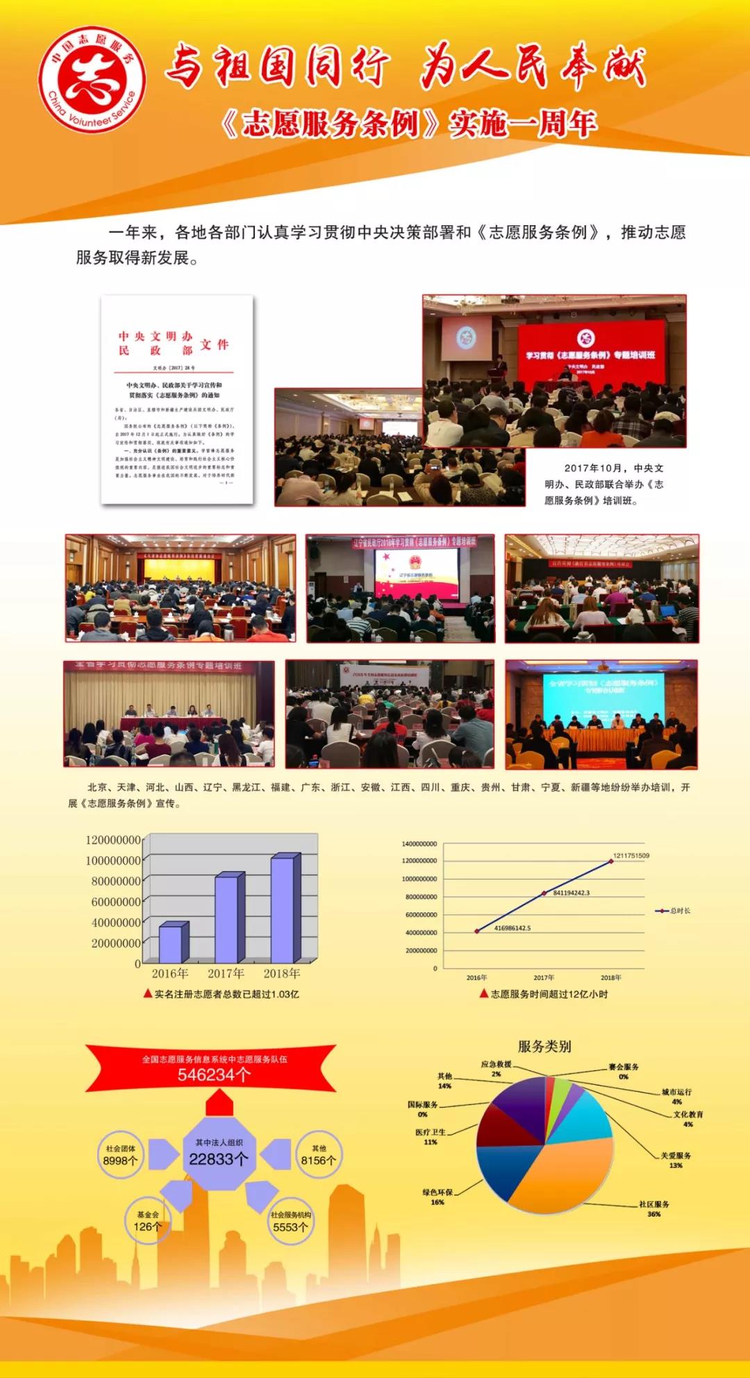 《志愿服务条例》实施一年来,在习近平新时代中国特色社会主义思想和党的十九大精神指引下,各地各部门认真贯彻中央决策部署,全面学习宣传落实《志愿服务条例》,举办了各种培训班、座谈交流会,出台了一系列贯彻落实意见和法规政策,志愿服务组织不断发展、志愿者队伍快速壮大、志愿服务规范化水平不断提升、服务成效进一步凸显。截至目前,全国志愿服务组织已超过1.2万家,全国志愿服务信息系统汇集的实名志愿者已经超过了1亿人,系统中记录的志愿服务时间累计达12亿小时,社会贡献价值超过180亿元。